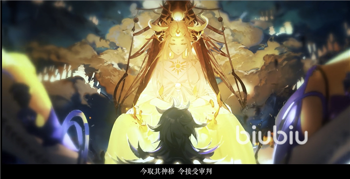 但在這個(gè)PV中,有一個(gè)審判,在一個(gè)巨大的天平上進(jìn)行稱重,一邊放的是八岐大蛇的神格,另外一邊放的是天照的神格,八尺鏡,如果八尺鏡的重量大于大蛇的神格,那么就會(huì)判定無罪,因?yàn)樯窀癖忍煺盏停煺赵敢獗幼o(hù),但如果神格的重量大于八尺鏡,那么就會(huì)判定為有罪,會(huì)立刻將其毀去,讓它灰飛煙滅。