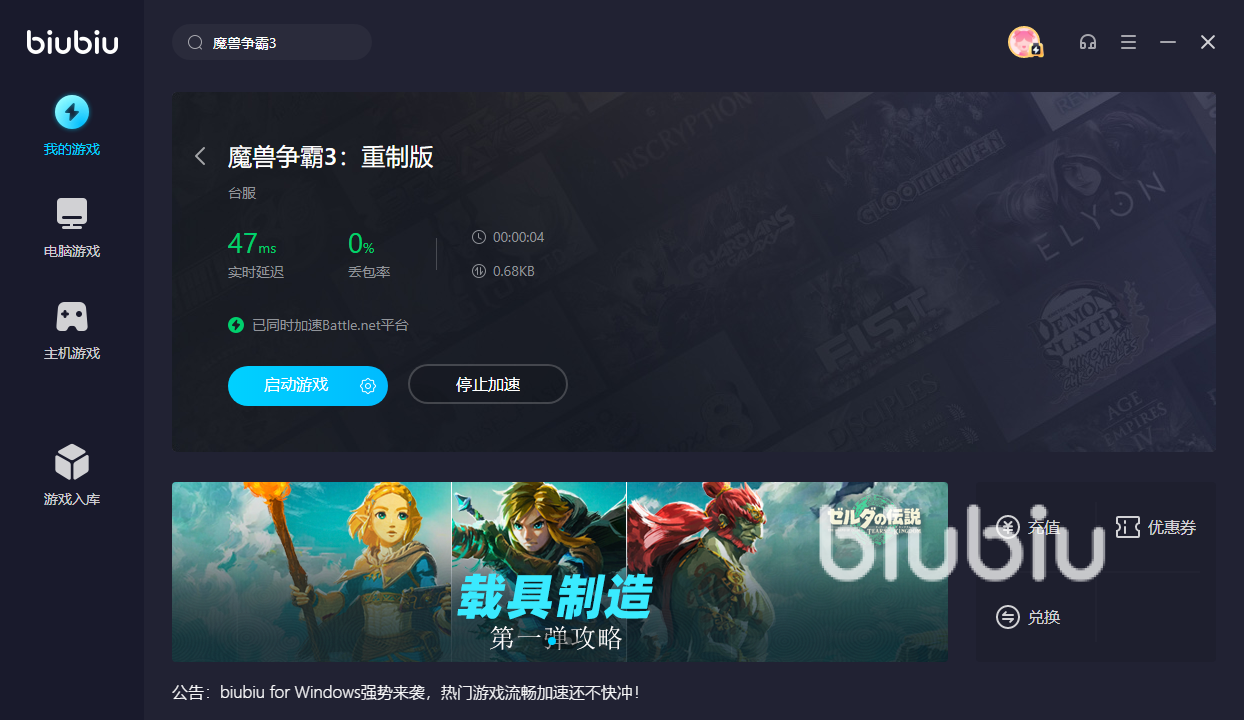 魔獸爭霸3重制版閃退解決問題聊到這里就要跟大家暫時告一段落了,小小的體積卻擁有著超級給力的功能,有了它的輔助之后讓你可以盡情在游戲中戰(zhàn)斗,享受超低延遲和穩(wěn)定的網(wǎng)絡連接,加速器試用期結(jié)束了之后如果覺得還不錯想要繼續(xù)充值使用的話,還可以享受最低四折的優(yōu)惠,有了biubiu之后再也不擔心會被各種網(wǎng)絡問題所困擾了,希望可以給有需要的伙伴們帶來幫助,感謝大家觀看。