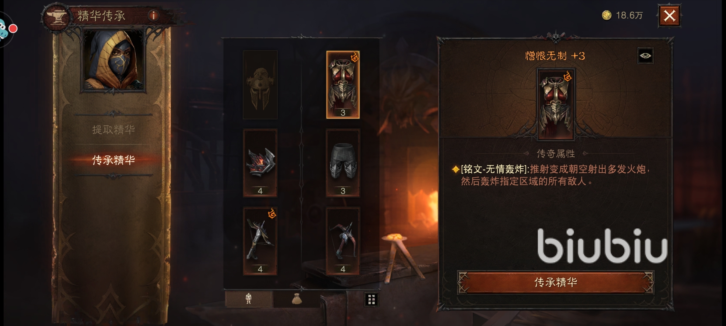 打開傳承精華界面,找到屬性最好的傳奇裝備,點擊傳承,在傳承后的框框里選擇剛才提取出來的精華,點傳承按鈕即可。