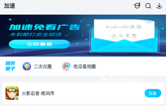 玩家在完成了第一次游戲加速之后,如果之后還想再次加速這款游戲,只需打開biubiu加速器,找到火影忍者疾風(fēng)傳這款游戲,點擊游戲旁的加速選項,就可以再次加速火影忍者疾風(fēng)傳了。