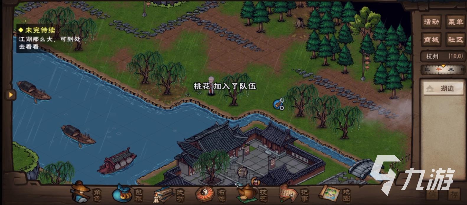 然后前往杭州,找客棧小二、藥鋪、繡坊詢問(wèn),前往(25,20),過(guò)完劇情,提醒一下需要是白天,此時(shí)能得到桃花,讓其入隊(duì)。