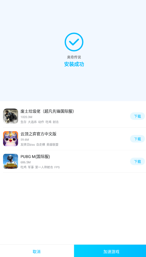 玩家在安裝好游戲之后,系統(tǒng)會(huì)提示玩家游戲已經(jīng)安裝成功,屆時(shí)玩家只需要下滑到該界面的最下側(cè),找到加速游戲選項(xiàng),點(diǎn)擊這個(gè)選項(xiàng),就可以開始加速這款游戲了。