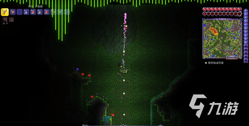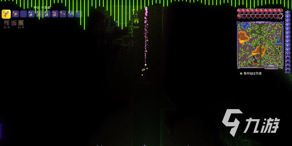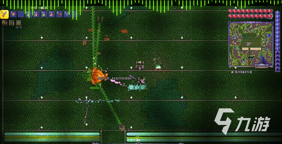 玩家在打敗肉山之后,就可以來到地下叢林召喚世紀(jì)之花了。世紀(jì)之花被玩家召喚出來的時(shí)候,會(huì)發(fā)出反射的光,而且花苞會(huì)隨機(jī)在地下,叢林各地刷新,如果玩家將叢林地圖都刷新出來了,那么在小地圖上就會(huì)顯示一個(gè)粉色的圖形。