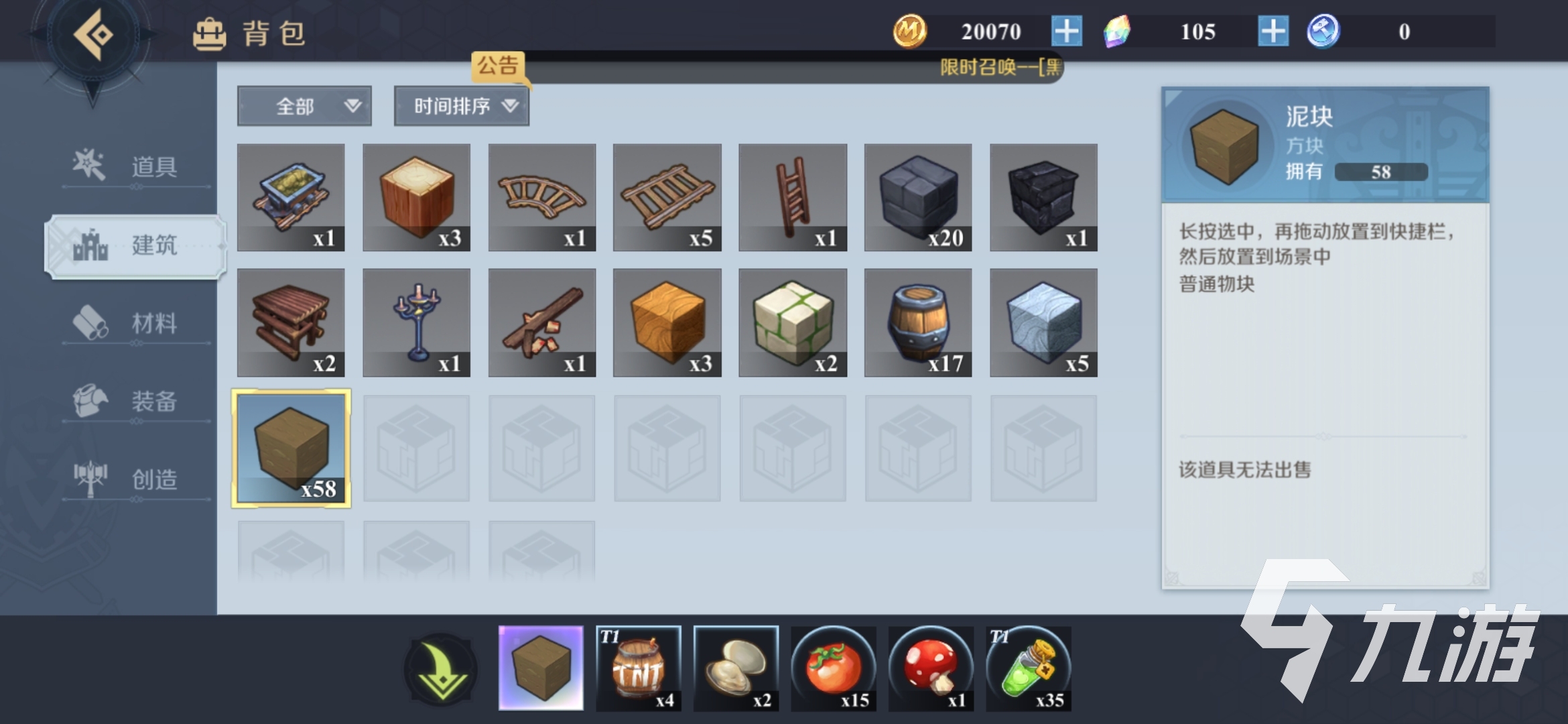 小伙伴在通過這兩中方式可以單塊或者集體獲得了,這時(shí)候小伙伴就可以點(diǎn)進(jìn)背包中,然后就可以發(fā)現(xiàn)泥土已經(jīng)在我們背包中了,這對(duì)于我們前期的生存是非常重要的,小伙伴可以試一試。