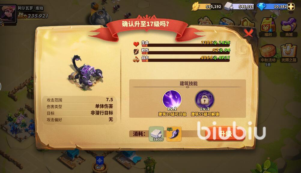 第三步增加戰(zhàn)斗力的方式,就是提升主城內(nèi)精銳戰(zhàn)蝎的等級(jí)。該英雄是主城當(dāng)中的核心防御力量,每一次等級(jí)的提升都會(huì)帶來(lái)大幅度戰(zhàn)斗力的增強(qiáng)。玩家們可以通過(guò)在其他副本當(dāng)中獲得的戰(zhàn)蝎毒刺來(lái)提升精銳戰(zhàn)蝎的等級(jí)。突破了55級(jí)之后,精銳戰(zhàn)蝎還會(huì)解鎖召喚仆從的技能,讓?xiě)?zhàn)斗力更上一層樓。