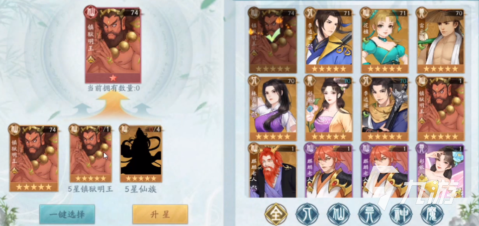 再來了解一下俠客升星的材料需求,以五星鎮(zhèn)妖明王為例子。這個俠客是屬于仙族的一個俠客,那么在升星的時候,除了需要本體之外,還需要玩家提供一個本體的五星鎮(zhèn)妖明王,這個只能夠通過抽卡和合成來獲得。除了核心的消耗之外,還需要四個五星仙族的俠客。