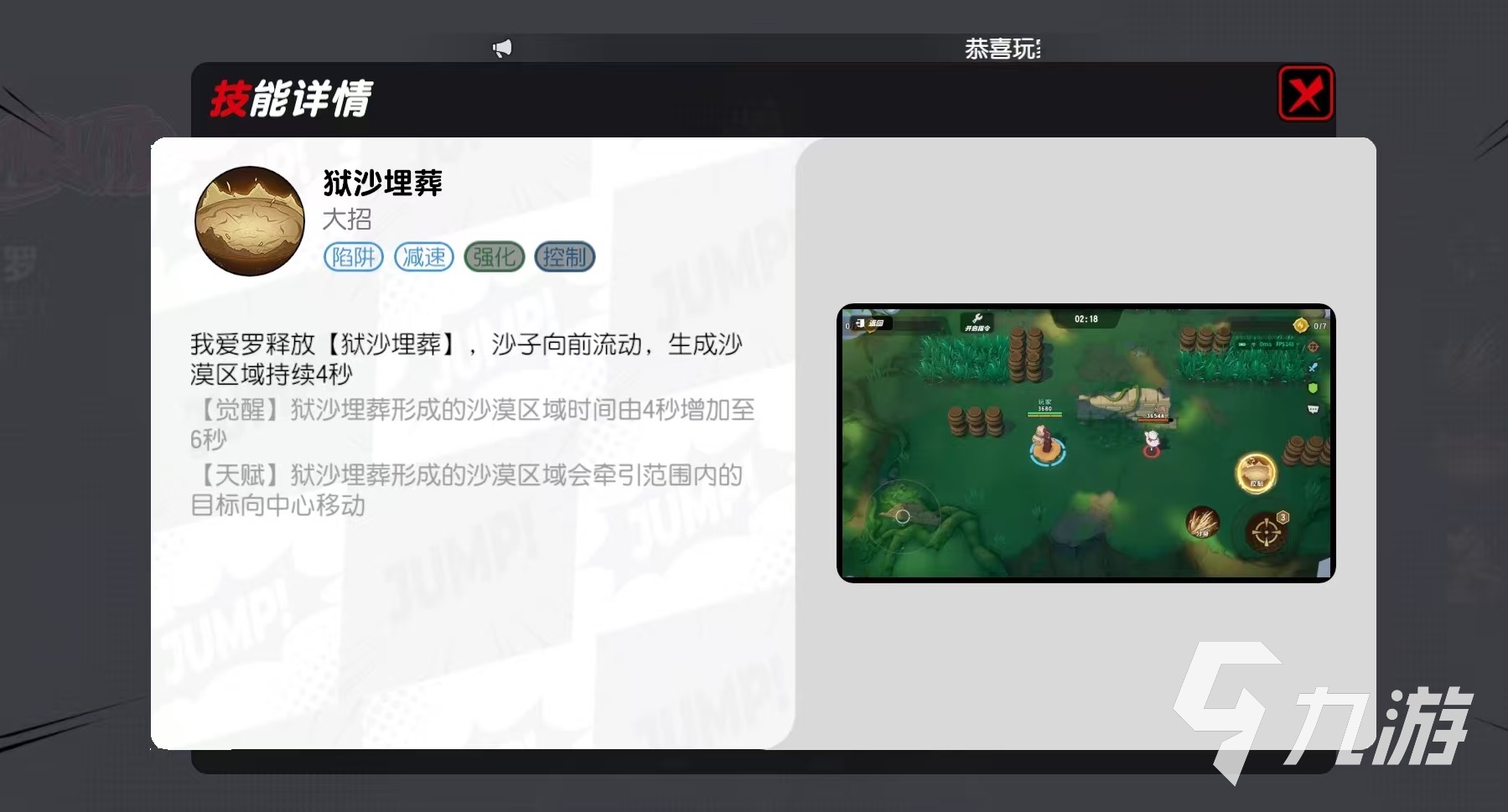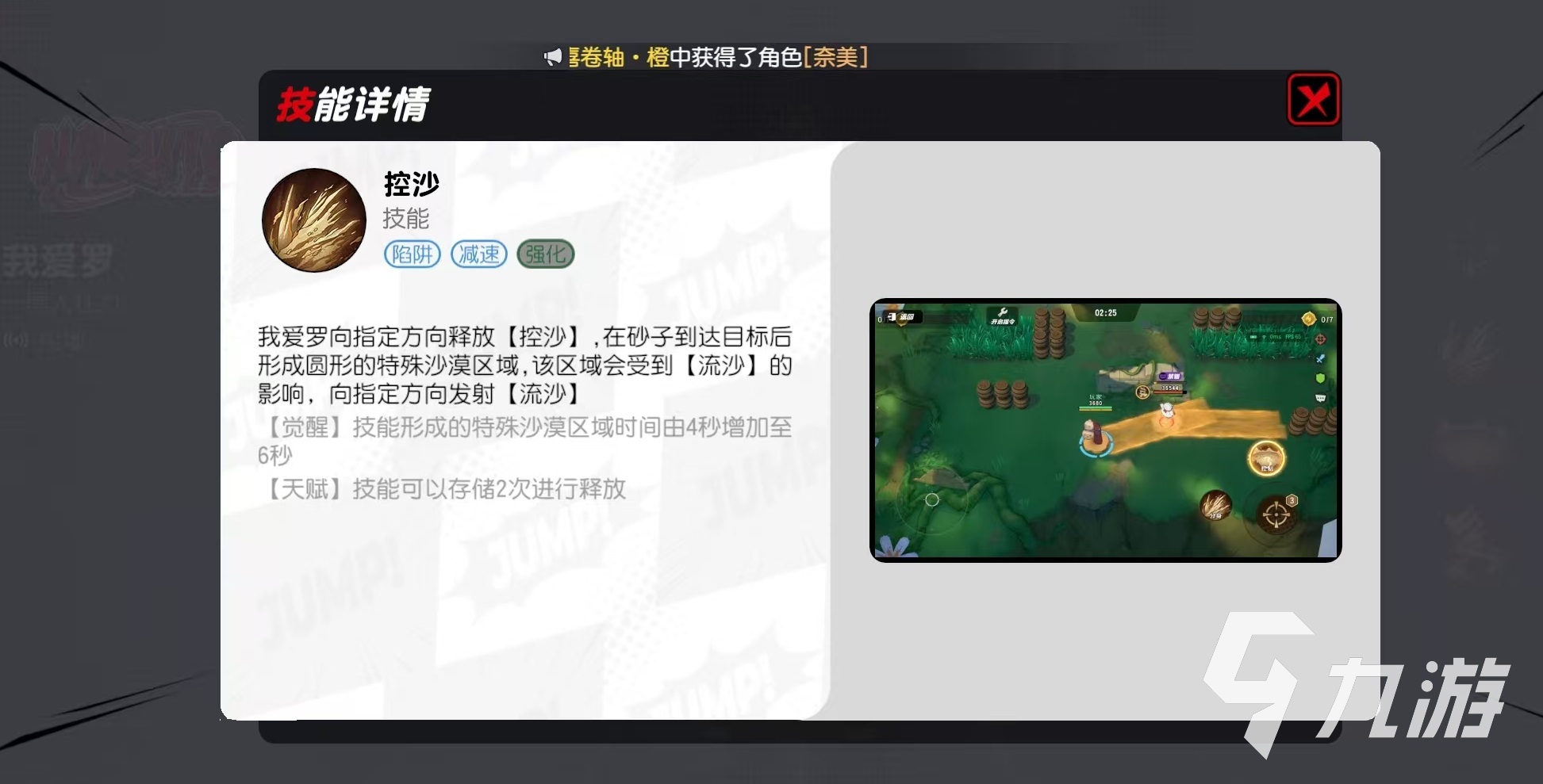 技能控沙,朝指定方向釋放控沙,當(dāng)沙子到達(dá)目標(biāo)之后,就會(huì)形成一片圓形的特殊區(qū)域,該區(qū)域會(huì)受到流沙的影響,向指定方向發(fā)射流沙。覺(jué)醒之后,技能形成的特殊區(qū)域持續(xù)時(shí)間增加到6秒鐘。大招釋放后,沙子向前流動(dòng)生成沙漠區(qū)域,持續(xù)4秒鐘。覺(jué)醒之后持續(xù)時(shí)間增加到6秒。被動(dòng)技能效果是我愛(ài)羅使用普攻或技能命中對(duì)手都會(huì)累積束縛槽,束縛槽滿值之后就會(huì)對(duì)目標(biāo)進(jìn)行長(zhǎng)達(dá)1.5秒的束縛,覺(jué)醒之后所需的束縛時(shí)間縮短。