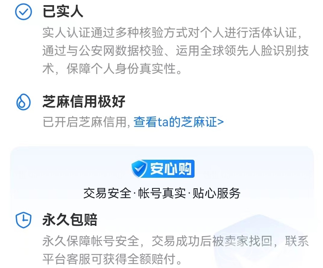 只要想在這里進行操作,無論是出售或是購買都進行非常嚴格認證,尤其是實人制和實名制加入,將很多不良用戶直接排除在外。而且每個上架賬號都會綁定好芝麻信用,這讓買家能直接查看到對方信用積分,可以選擇和信用好的出售者打交道,這樣也是為了營造良好交易氛圍,讓遵守誠信賣家能出售更快。如果想要擴展交易項目,必須成為誠信賣家,還需要額外繳納保證金,自然在交易行為方面會更加良好。