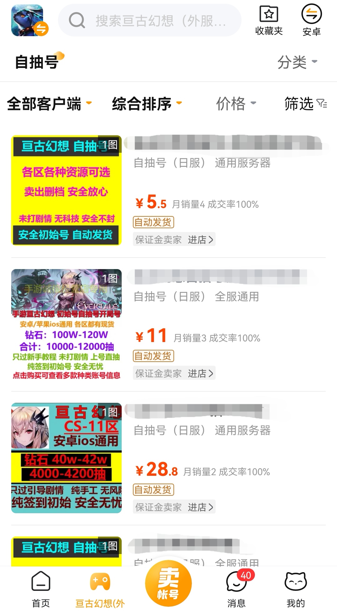 而且在交易貓平臺當(dāng)中購買游戲賬號流程也非常簡單,首先需要找到對應(yīng)的游戲?qū)^(qū),以亙古幻想為例,直接通過搜索框找到亙古幻想專區(qū),之后你就能看到非常多的商品鏈接了,這些鏈接在等級和裝備資源等方面都有很大的差距,大家可以根據(jù)自己真實(shí)的想法和需要的東西來查看詳細(xì)信息,隨后再做出決定是否要購買。平臺推出的篩選功能和排序功能都能輔助大家來找到目標(biāo)賬號鏈接。