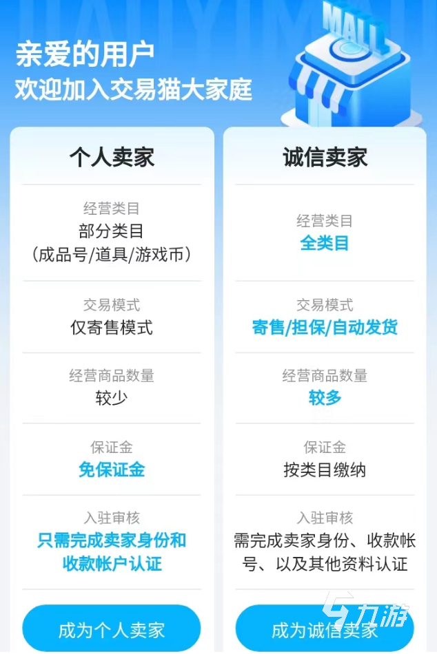 3、成功得到了想要的價值區(qū)間之后,玩家們就可以在平臺當中申請開通賣家身份了。注意的是,日后如果大家想要在平臺內(nèi)處理游戲號的話,沒有此身份的加持各位將無法成功發(fā)布商品,所以提前開通一個也將幫助大家后期更有效率的來處理自己的游戲號。