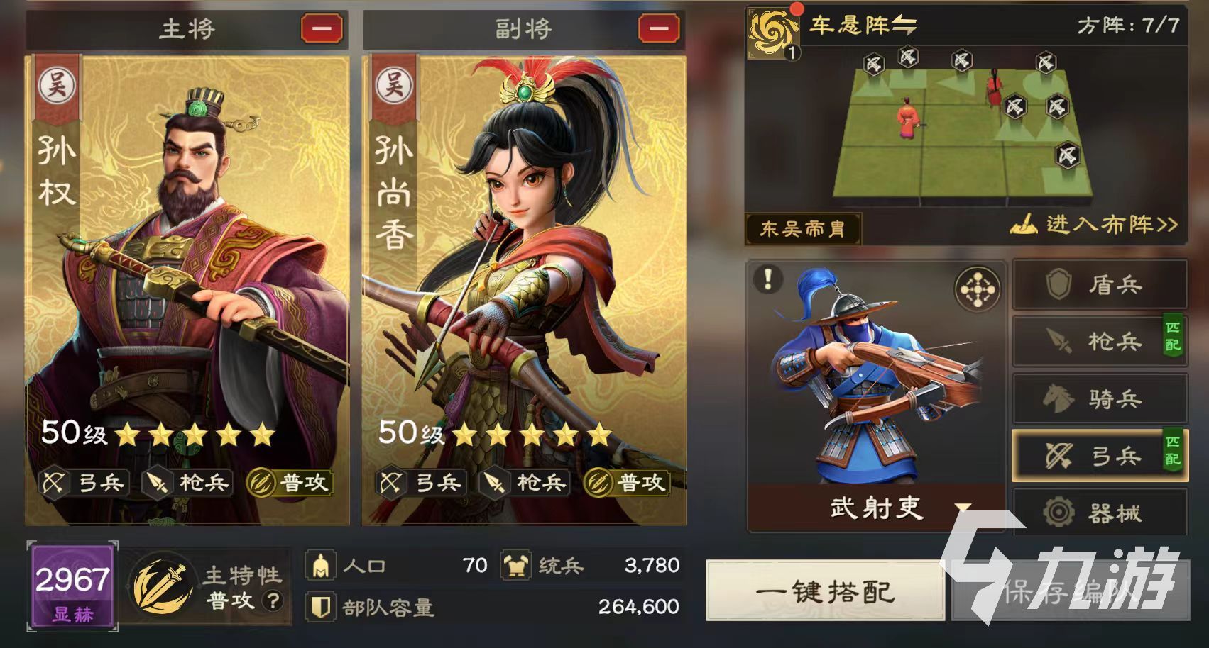 目前主要的弓兵體系包括兩種流派,分別是普攻流和異常流,普攻流是目前最常見也是最穩(wěn)定的搭配方式,而異常流則對于練度有一定的要求。例如可以搭配出孫權(quán)和孫尚香組合的弓箭手部隊,兵種選擇武射吏,有概率擊退和提升暴擊的效果,這二人同隊能激活羈絆,提高普攻增傷。孫權(quán)被動效果可提高部隊暴擊率和暴擊傷害,孫尚香被動可提供普攻增傷,這樣在戰(zhàn)斗中就可以依靠普攻打出高額輸出。孫尚香還可以大幅度提升隊伍的穿透屬性,這樣在遠距離作戰(zhàn)時能減少士兵的損耗,提升持續(xù)作戰(zhàn)能力。