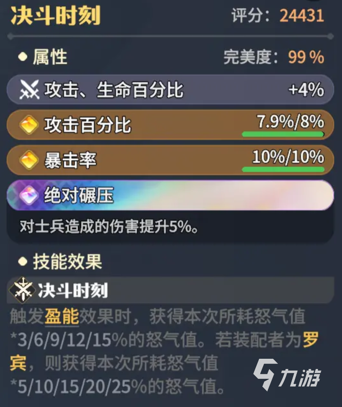 決斗時(shí)刻:戰(zhàn)斗中觸發(fā)盈能效果獲取怒氣;戰(zhàn)意激增:提升怒氣恢復(fù)速度;殘暴之力:增強(qiáng)范圍傷害輸出;洗煉屬性建議:攻擊力、回怒加成、暴擊率。怒氣值決定了羅賓技能的釋放頻率,因此優(yōu)先提升回怒效率至關(guān)重要。