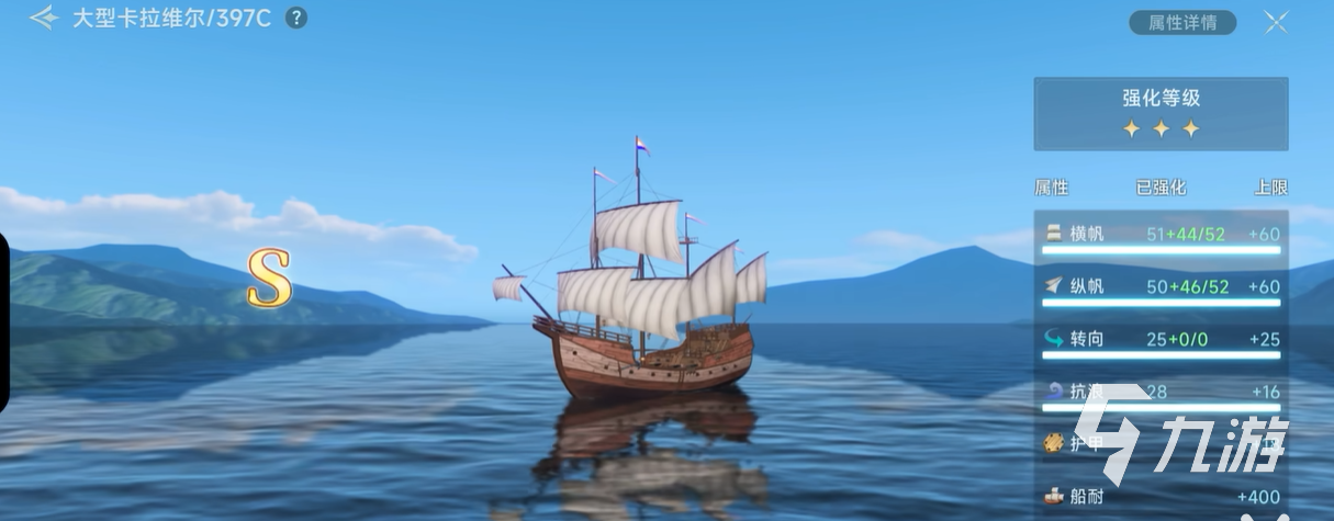 最后就是一顆星直接晉升到s級(jí)船只,這個(gè)船只的升級(jí)思路會(huì)有些變化,玩家們可以觀看船只的四個(gè)值,分別是橫帆,縱帆,抗浪以及轉(zhuǎn)向,這四個(gè)數(shù)值都是要求達(dá)到滿級(jí)的,這樣才能晉升為s級(jí)船只,玩家們需要查看自己缺少哪個(gè)數(shù)值。