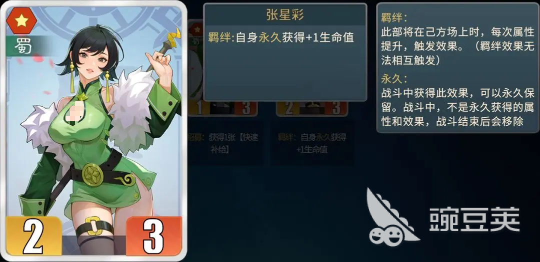 2、張星彩:前期的過渡卡,”羈絆“只能帶來血量加成,如果裸上強(qiáng)度相對一般,需要配合有屬性加成的部將或者統(tǒng)帥使用效果才比較好。