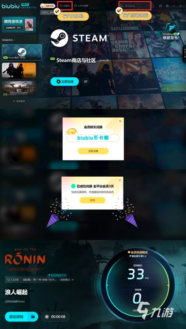 上方給大家推薦的這個加速器是很適合新用戶去用的,因為給大家?guī)砹瞬簧俚暮锰?,比如注冊的時候會得到平臺給大家送的三個小時免費加速時間,后續(xù)還可以利用兌換碼biubiu不卡頓繼續(xù)換到手三天的體驗時間。