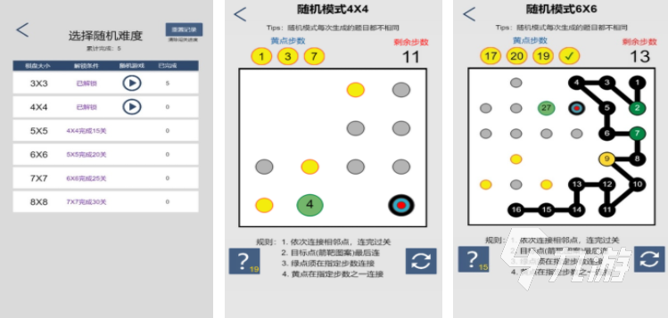 在連點(diǎn)呈現(xiàn)里,會(huì)用關(guān)卡的形式開啟挑戰(zhàn),每關(guān)卡中都會(huì)給出幾個(gè)圓點(diǎn),在這些圓點(diǎn)中有起始點(diǎn),有終點(diǎn),玩家需要根據(jù)這些點(diǎn)位的位置,依次把他們連接起來(lái),連成一條完整的直線,在連接的過(guò)程中,連線不能交叉不能重疊,非??简?yàn)每一個(gè)點(diǎn)位的連接順序,每一關(guān)的點(diǎn)位順序也都不一樣,玩家可以在游戲里不斷動(dòng)腦。