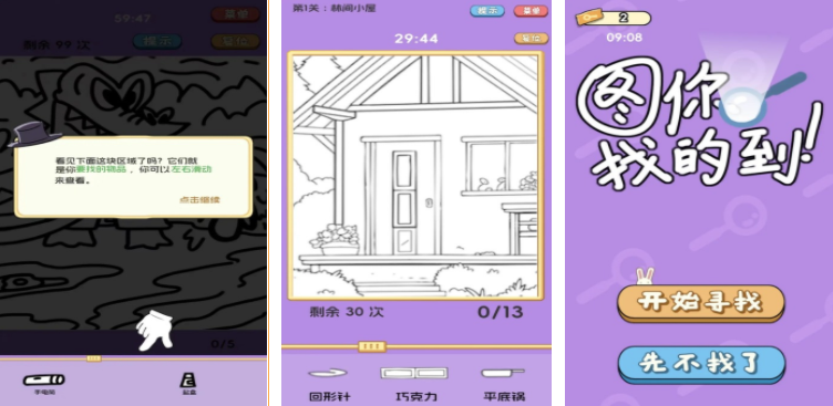 圖你找的到非常考驗(yàn)玩家的觀察能力,進(jìn)入到這個(gè)游戲之后,場(chǎng)景上會(huì)出現(xiàn)一個(gè)沒(méi)有涂色的畫稿,同時(shí)在畫稿下方還會(huì)給出幾個(gè)物品,這些物品會(huì)巧妙的融入到畫作中,玩家需要做的就是在上方的畫作中尋找下方隱藏的物品,每一關(guān)的場(chǎng)景,包括需要找的物品都不一樣,可以通過(guò)拖動(dòng)放大的方式,仔細(xì)查看畫作的每一處細(xì)節(jié),這樣才能在最短的時(shí)間內(nèi)順利找到物品。
