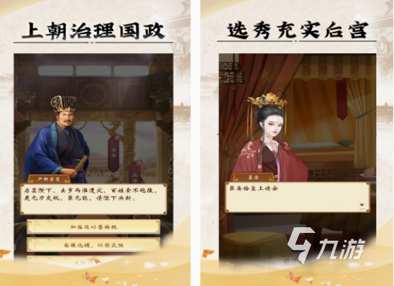在游戲?qū)儆诓呗责B(yǎng)成類型的,身為皇帝的你,在這里面可通過挑選武將、文臣,想辦法的提升國力。通過親自處理朝政以及融入各諸多的趣味性的玩法,幫助你成為見證每個盛世王朝的發(fā)展過程。包括在上朝有時候,也通過一種真實模擬方式,幫助你有身臨其境當皇帝的體驗。更融入了后宮選妃以及征戰(zhàn)四方等,與皇帝有關(guān)的事情。