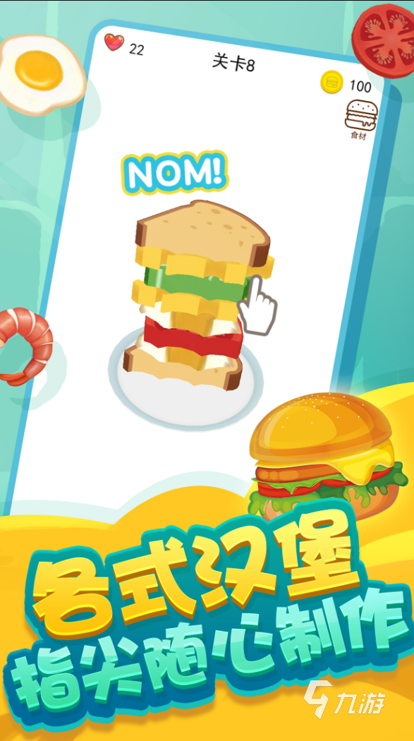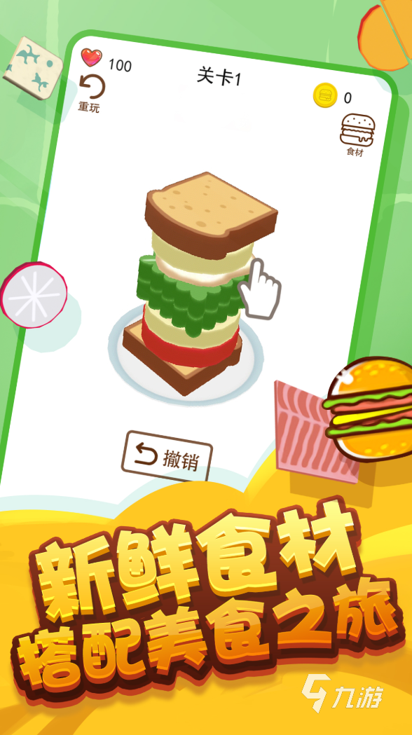關于指尖漢堡的玩法其實大致分為兩個,第一種就是前期通過不斷的闖關,游戲會呈現兩個面包片和一堆食材,而玩家們需要動動手指將所有的食材夾在面包中間,但是也要考慮中間食材所布置的合理性,比如說檸檬和西紅柿同時放置會有額外反應,而芹菜和蔬菜沙拉同樣為綠色搭配起來太丑,顧客不滿意等等,達不到闖關條件是無法解鎖后續(xù)關卡的。
