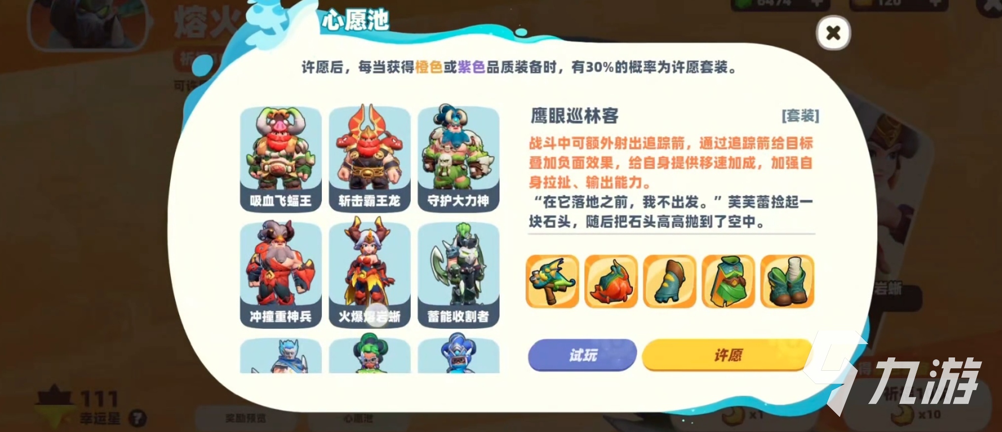 游戲?qū)oguelike元素融入戰(zhàn)斗成長,為此,在開局時,玩家們是需要確定角色的發(fā)展流派,這樣才可以更好地去培養(yǎng)TA,給其搭配上合適的套裝,套裝可以通過心愿池獲得,有機(jī)會得到橙色或者紫色品質(zhì)的套裝哦!