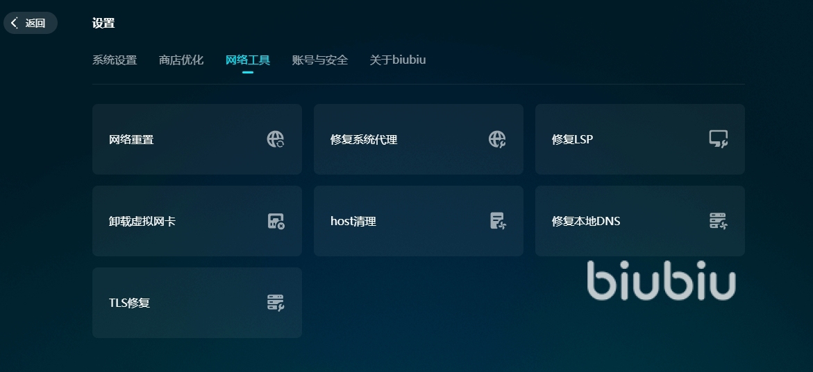 在線狀態(tài)度穩(wěn)定了之后,我們基本上不會(huì)遇到什么因?yàn)榫W(wǎng)絡(luò)狀態(tài)出現(xiàn)的黑屏閃退了。如果是因?yàn)樵O(shè)置原因出現(xiàn)了問(wèn)題,比如說(shuō)網(wǎng)關(guān)出錯(cuò),LSP出錯(cuò)等,其實(shí)biubiu也留了后手的,我們只要在設(shè)置里面找到網(wǎng)絡(luò)工具就可以好好修復(fù)了。